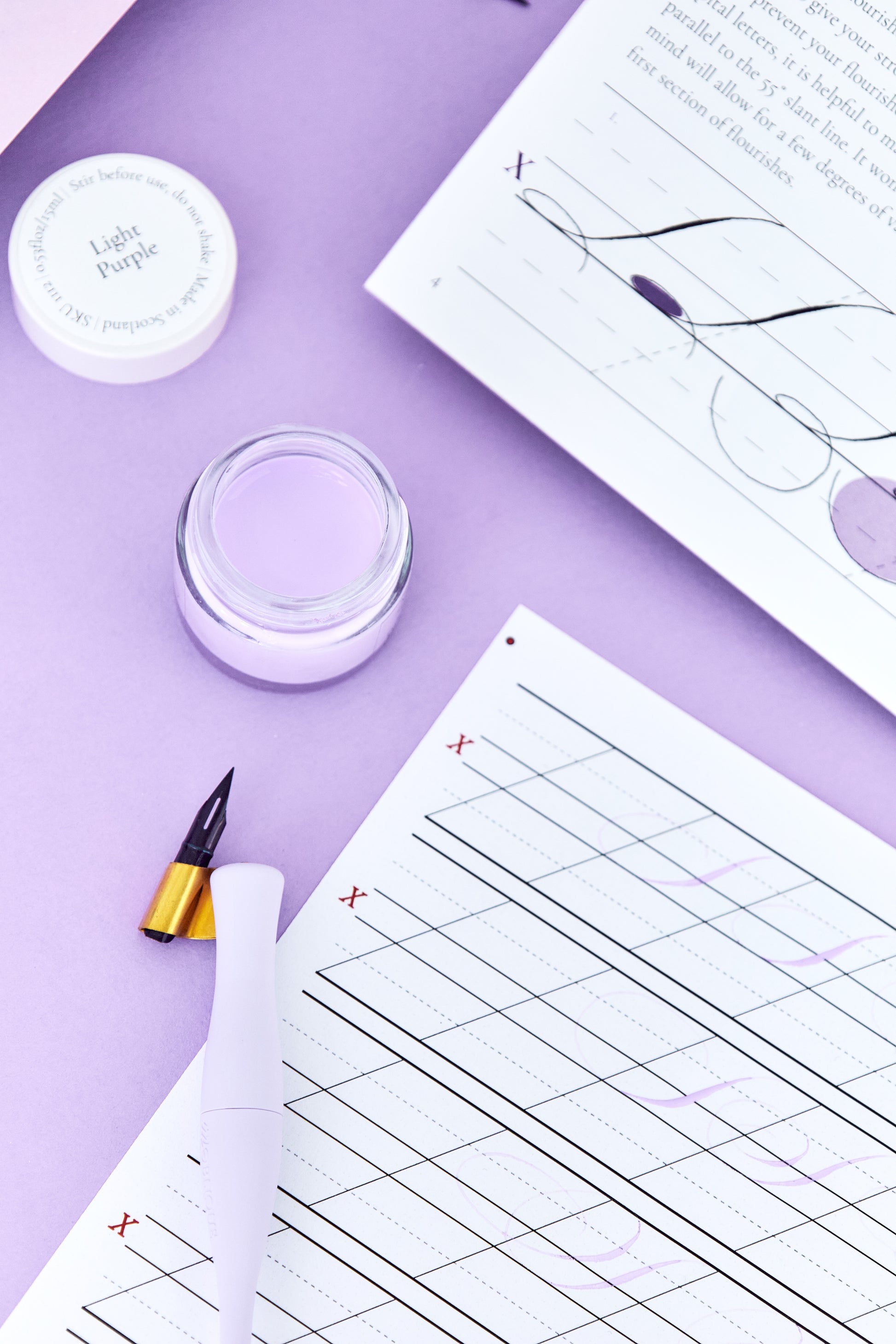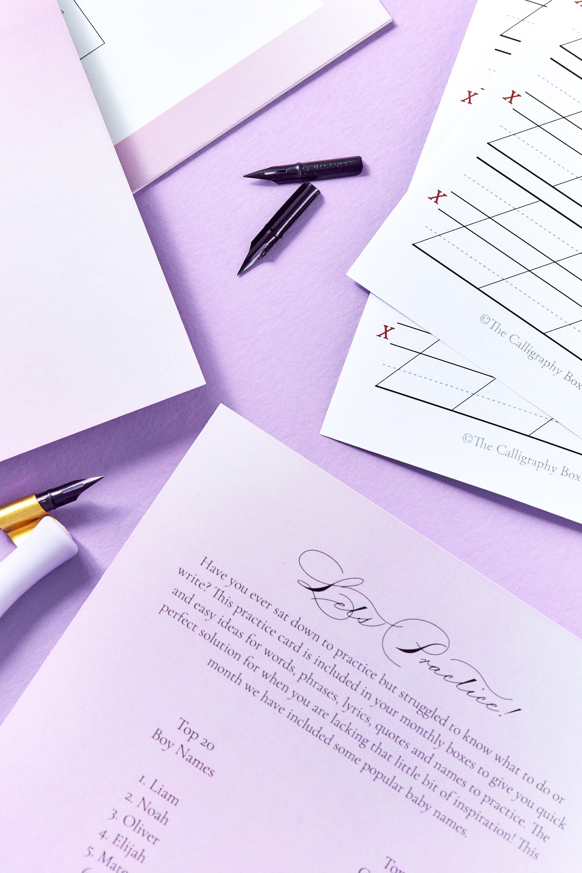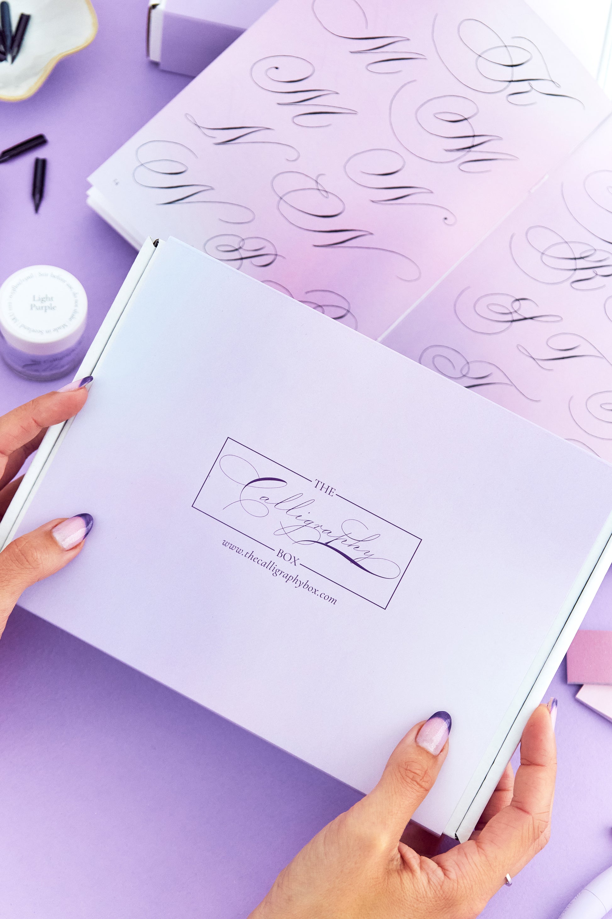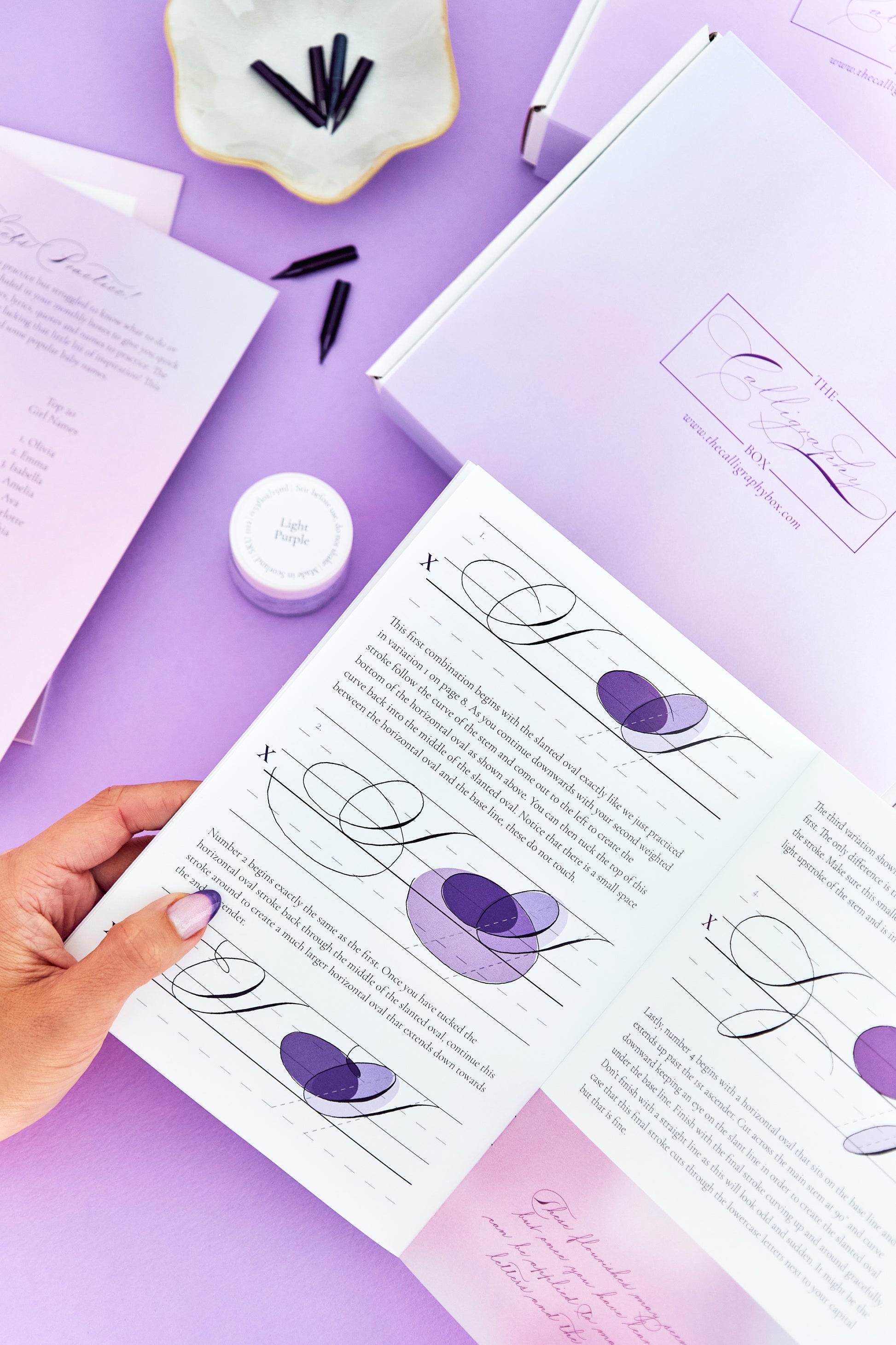 This past Calligraphy Box includes a detailed workbook and video lesson on how to add elegant flourishes to your capital letters. There is also a Gillott 404 nib, light purple ink, practice sheets, flourishing card and practice card included. You will also receive access to our private online community.