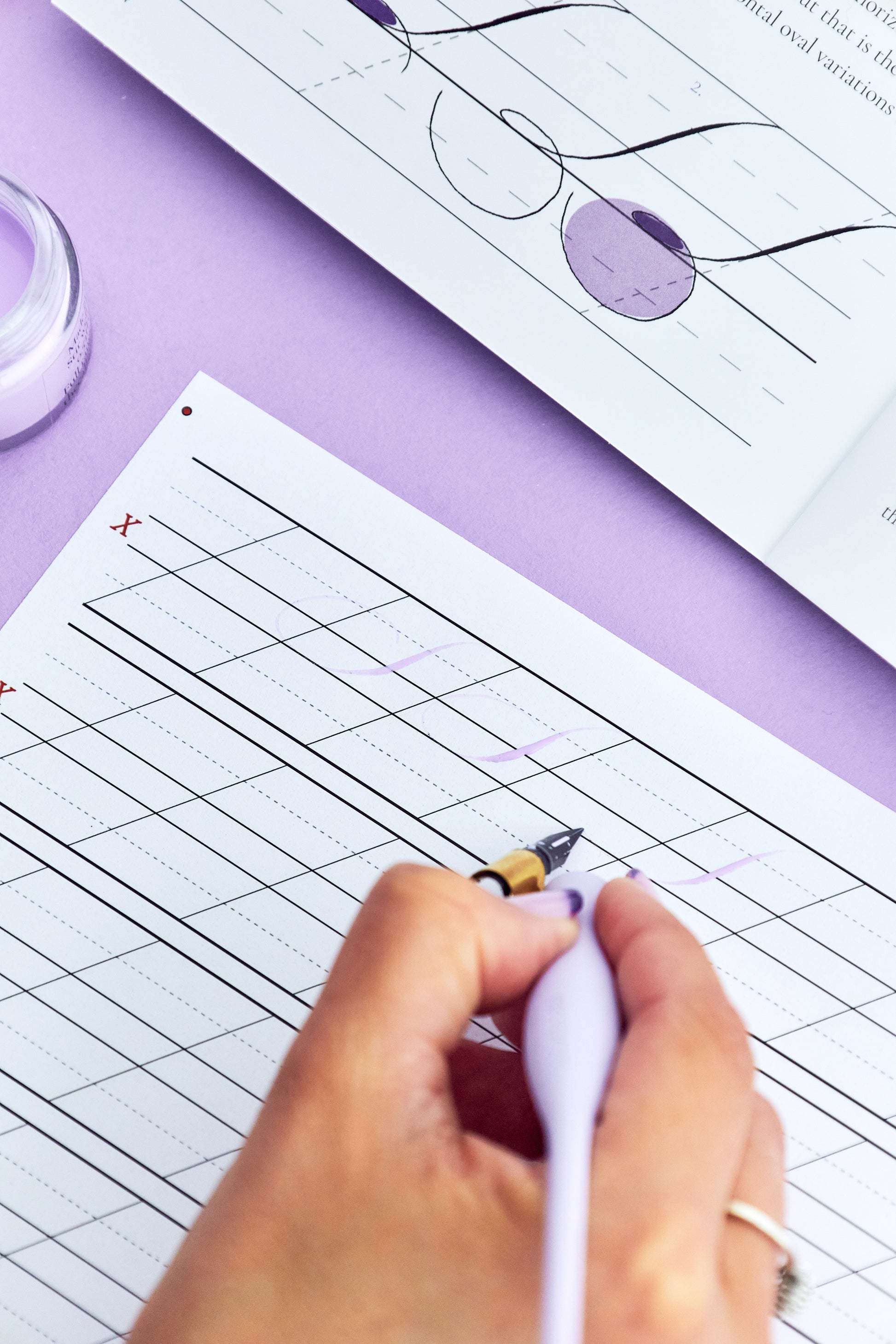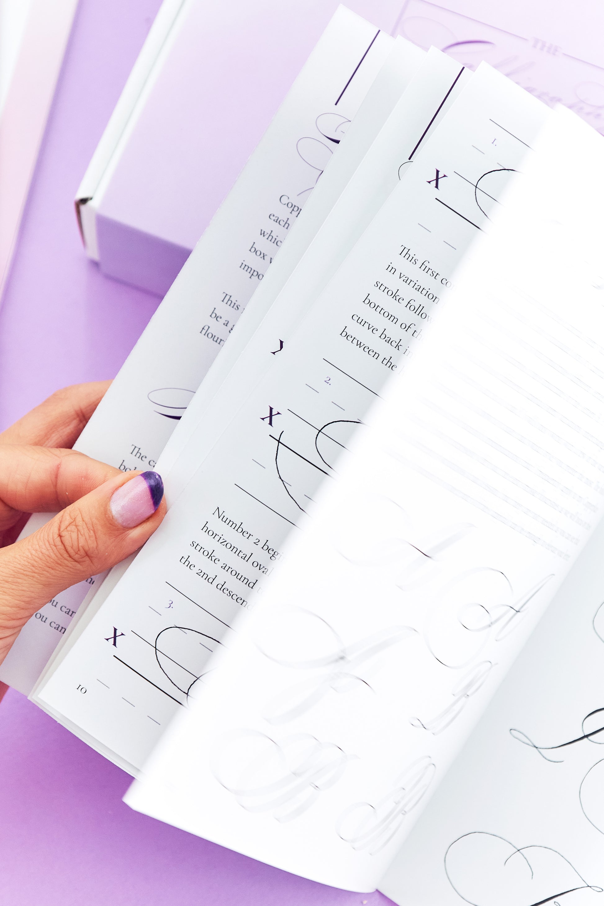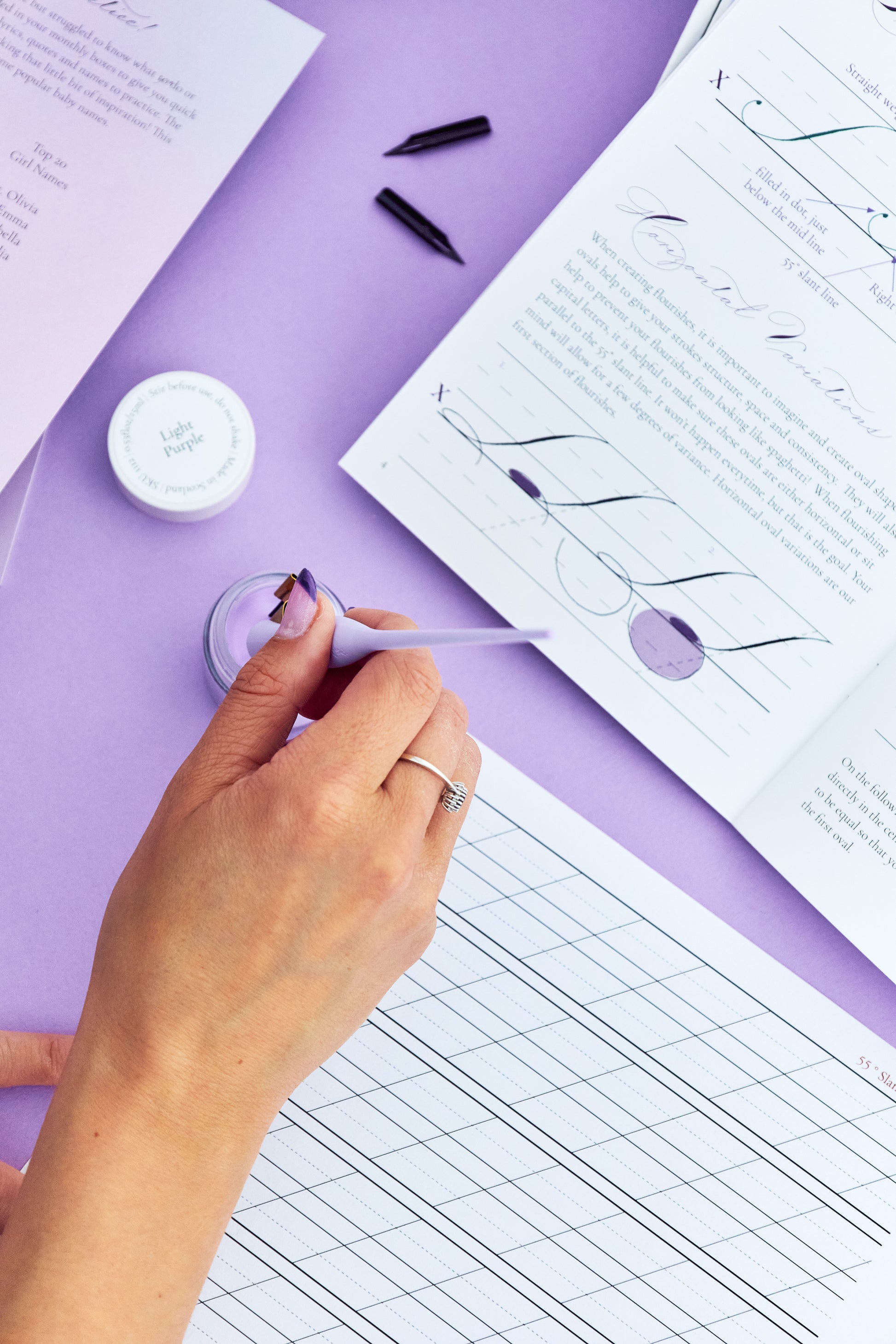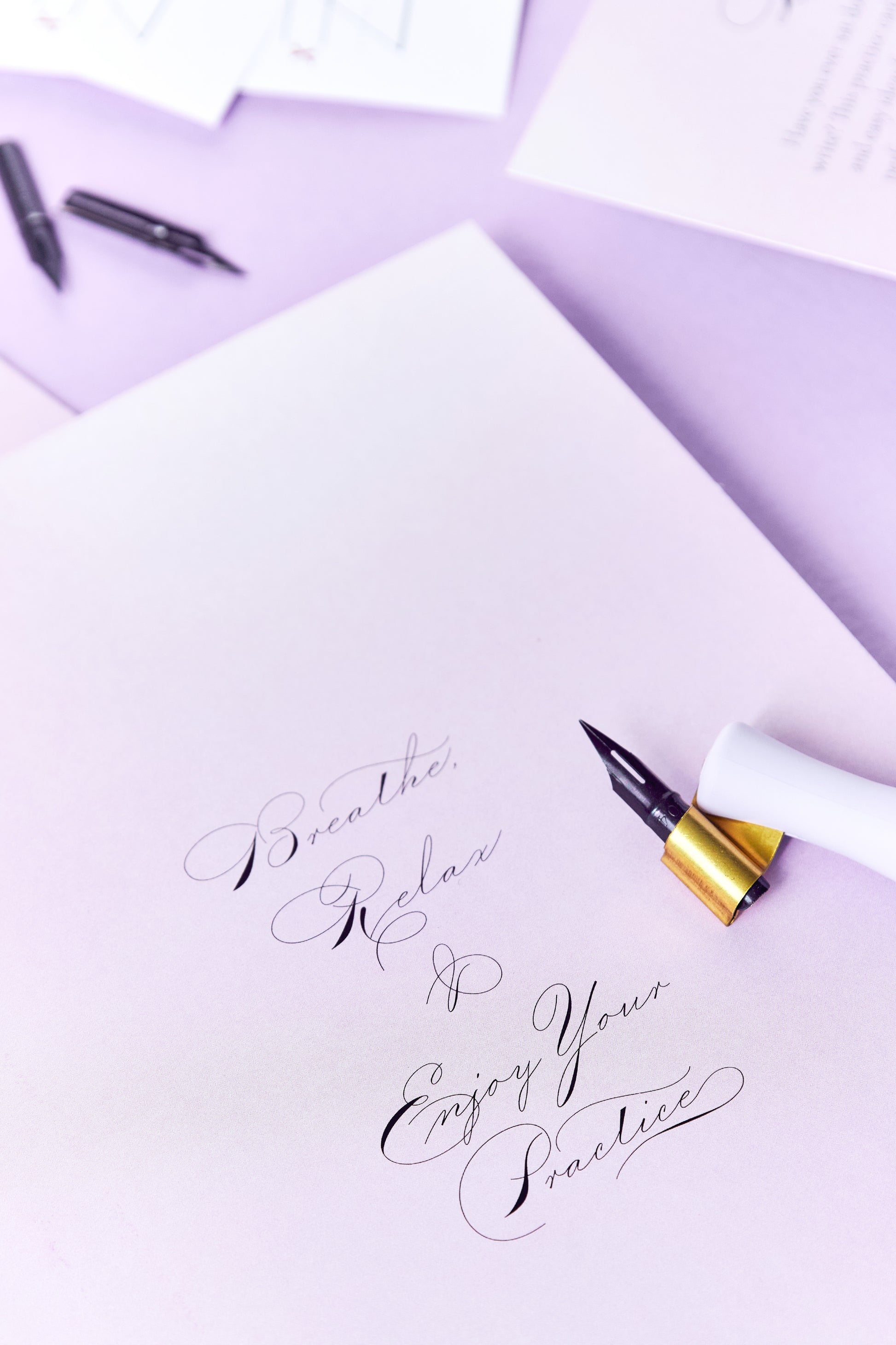 This past Calligraphy Box includes a detailed workbook and video lesson on how to add elegant flourishes to your capital letters. There is also a Gillott 404 nib, light purple ink, practice sheets, flourishing card and practice card included. You will also receive access to our private online community.