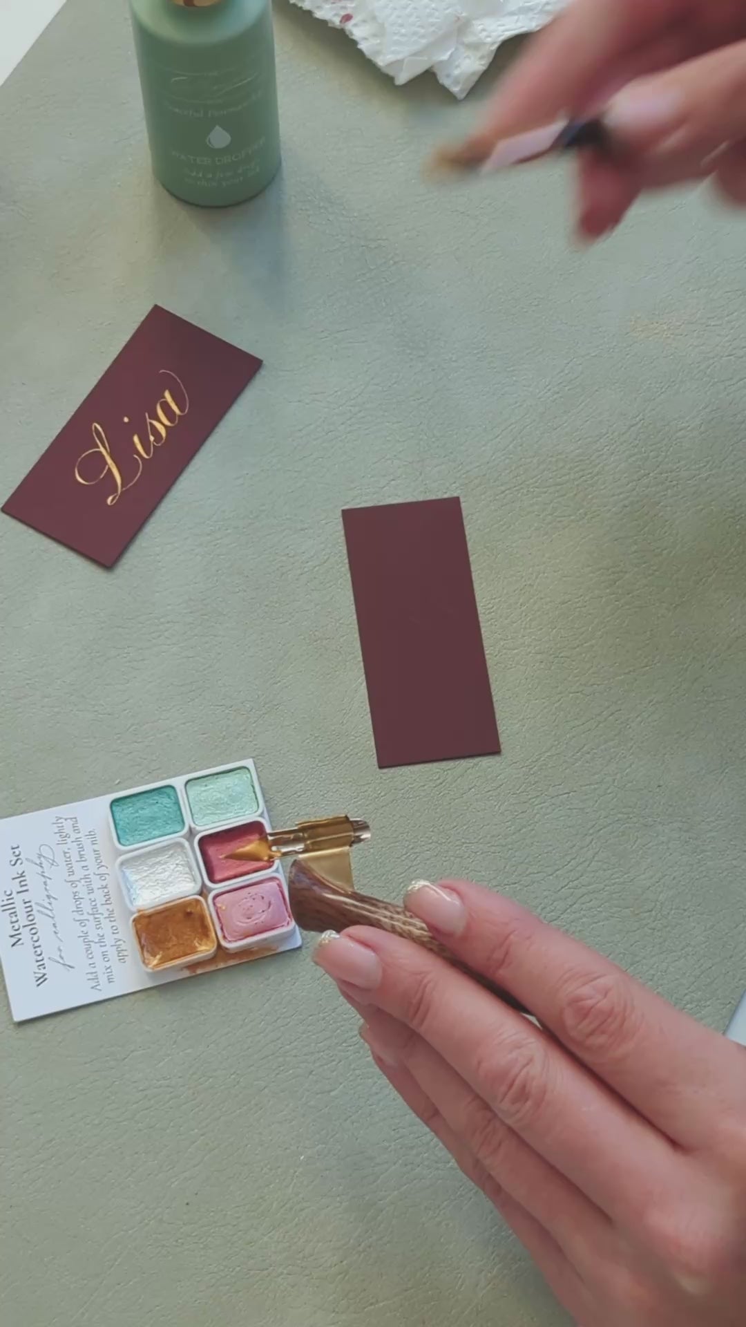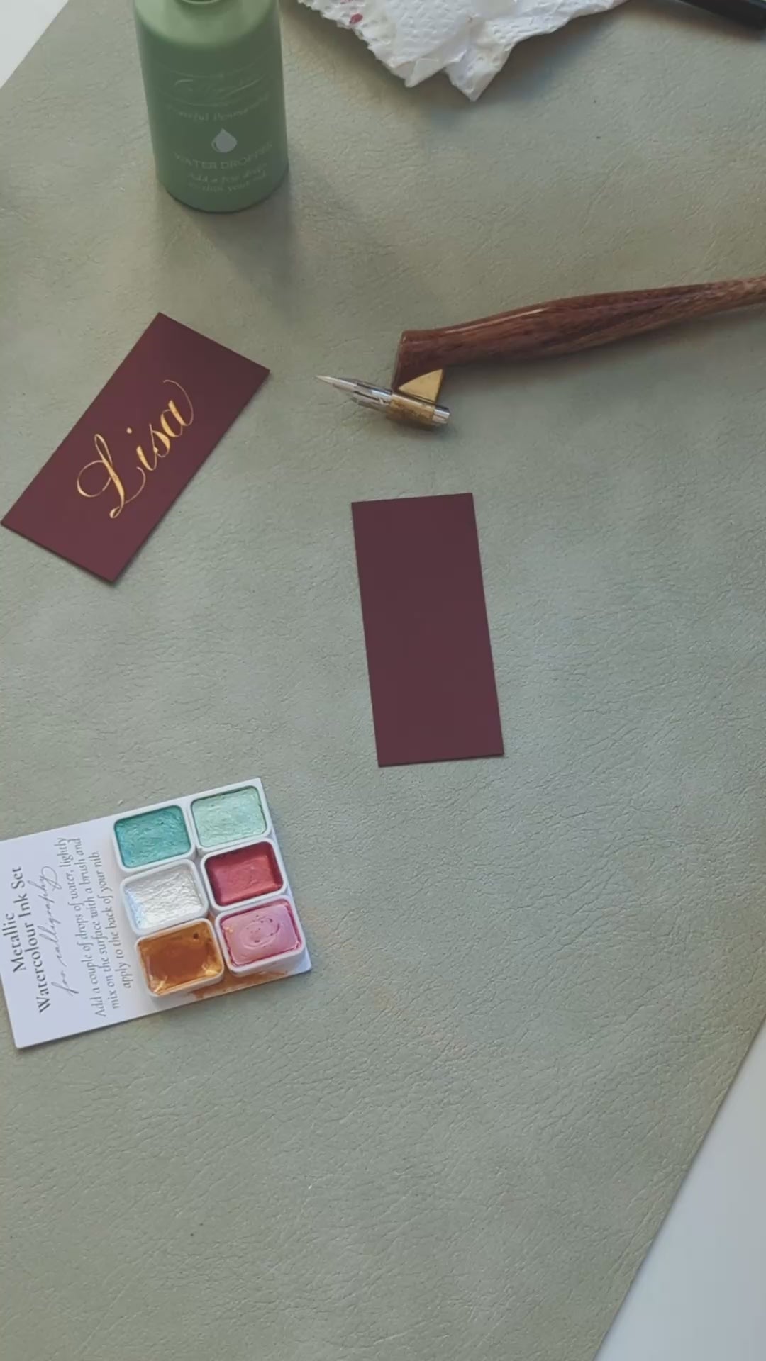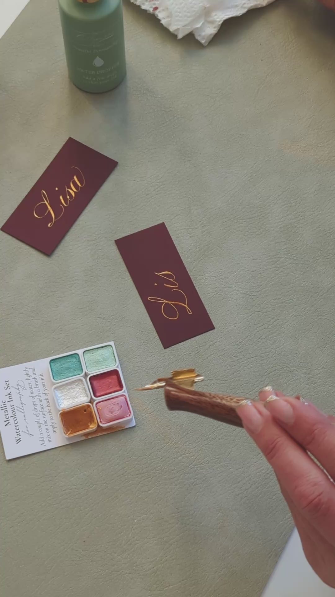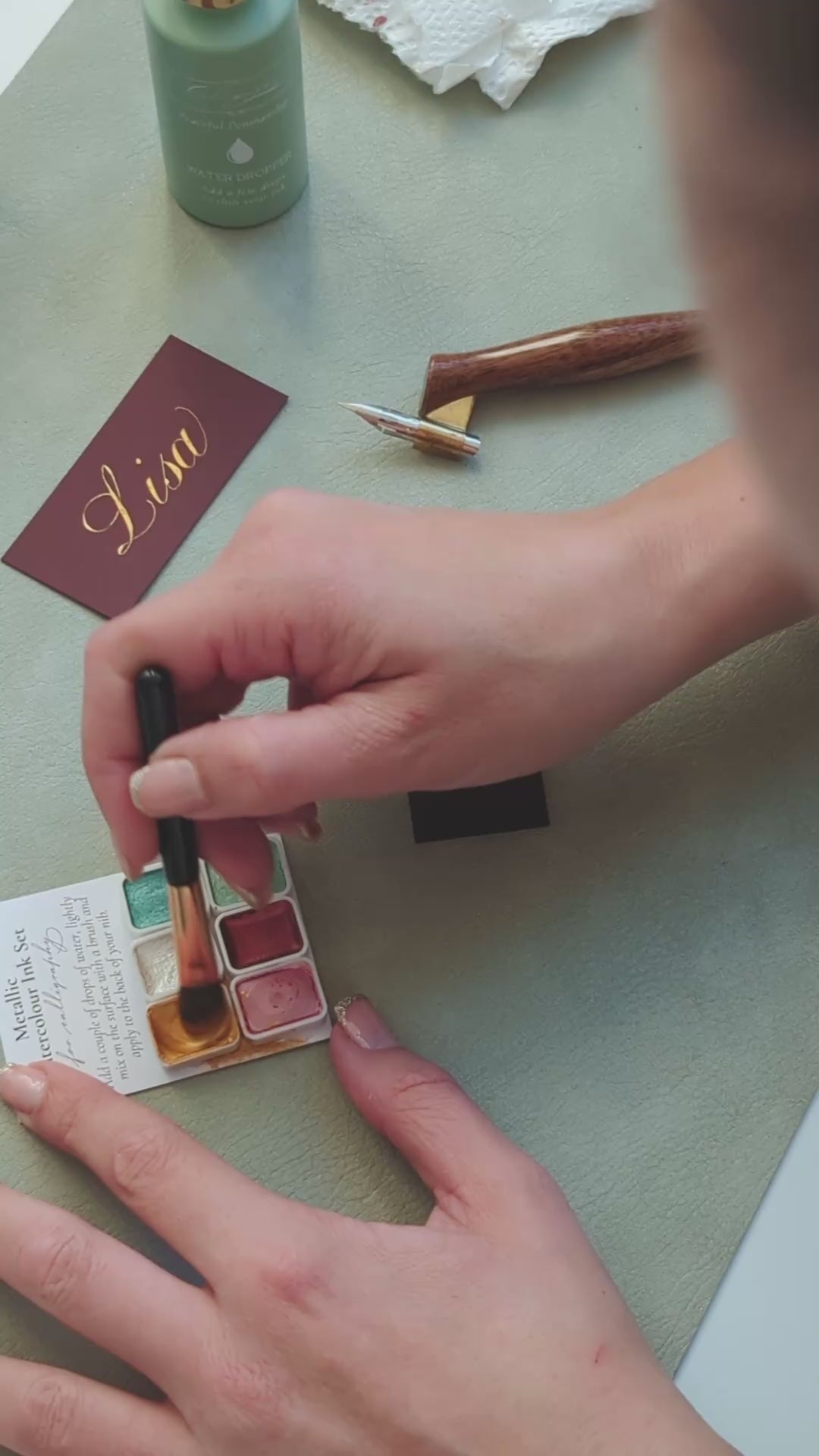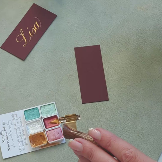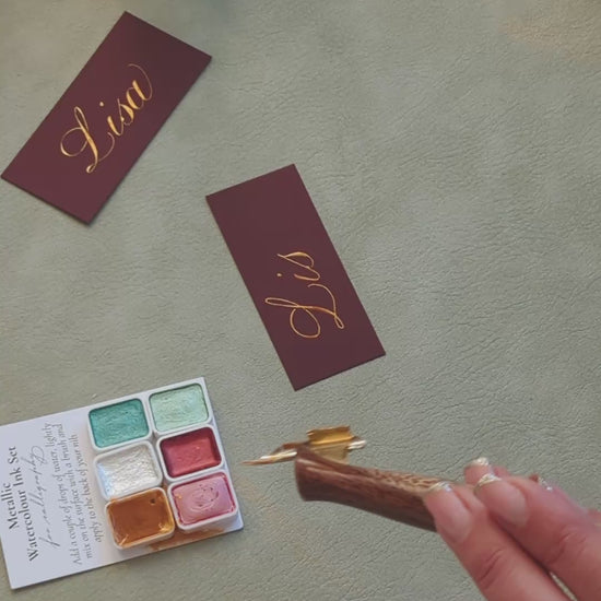 This concentrated watercolour ink works beautiful for calligraphy on dark paper. Use your water dropper to add a couple of drops of water to the top of one of the colours. Use the small brush included to mix the water into the pigment. You will see it gradually pick up the ink and turn into the bright metallic colour. Keep mixing until it becomes a single cream-like thickness. You can then use the brush to apply some of the ink to the back of your nib (under the curve). Hold your nib over the ink to let any excess ink drip off and then begin to write.